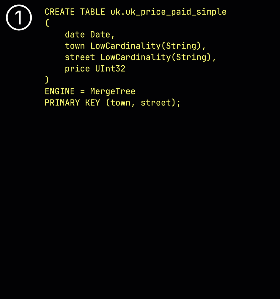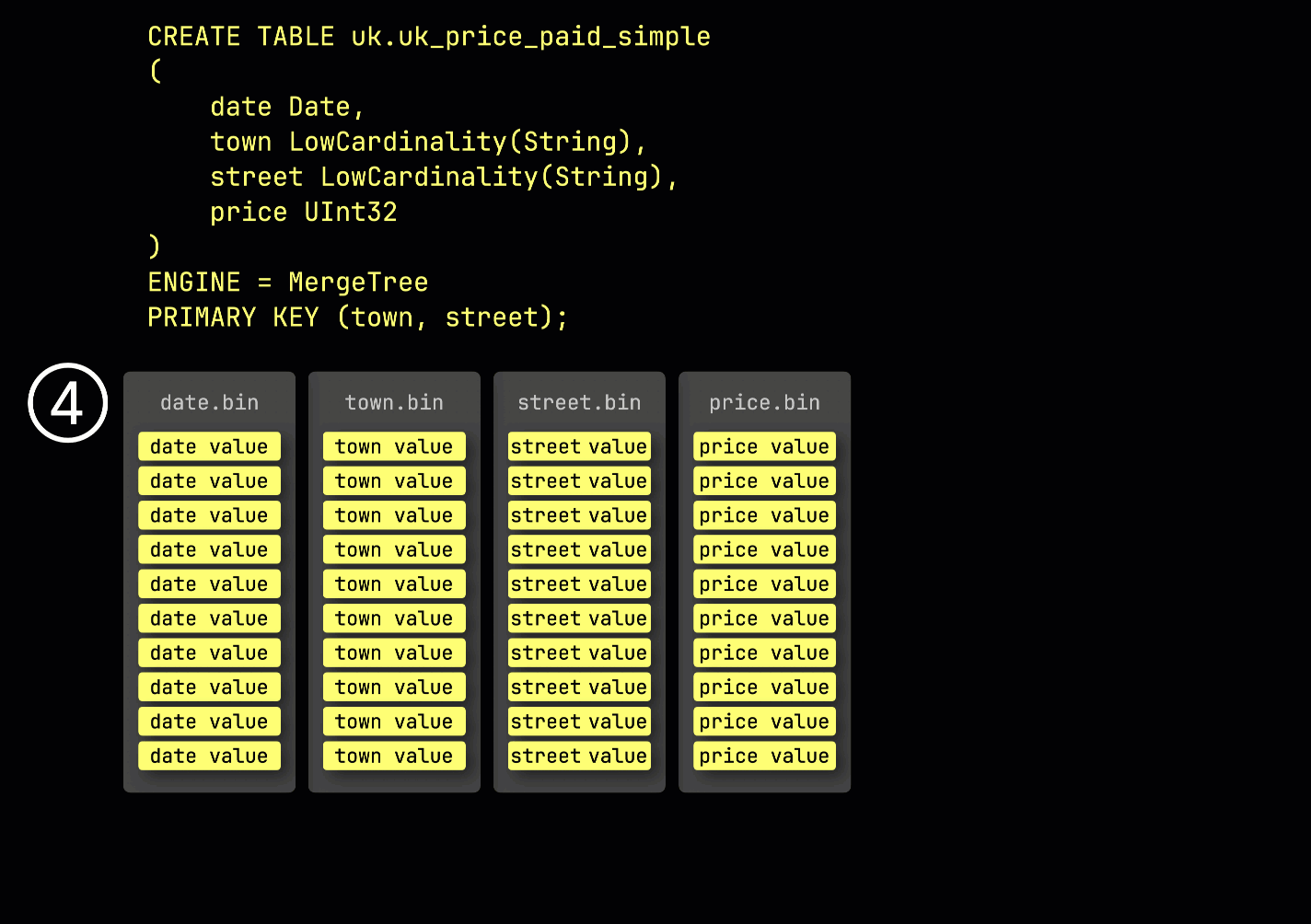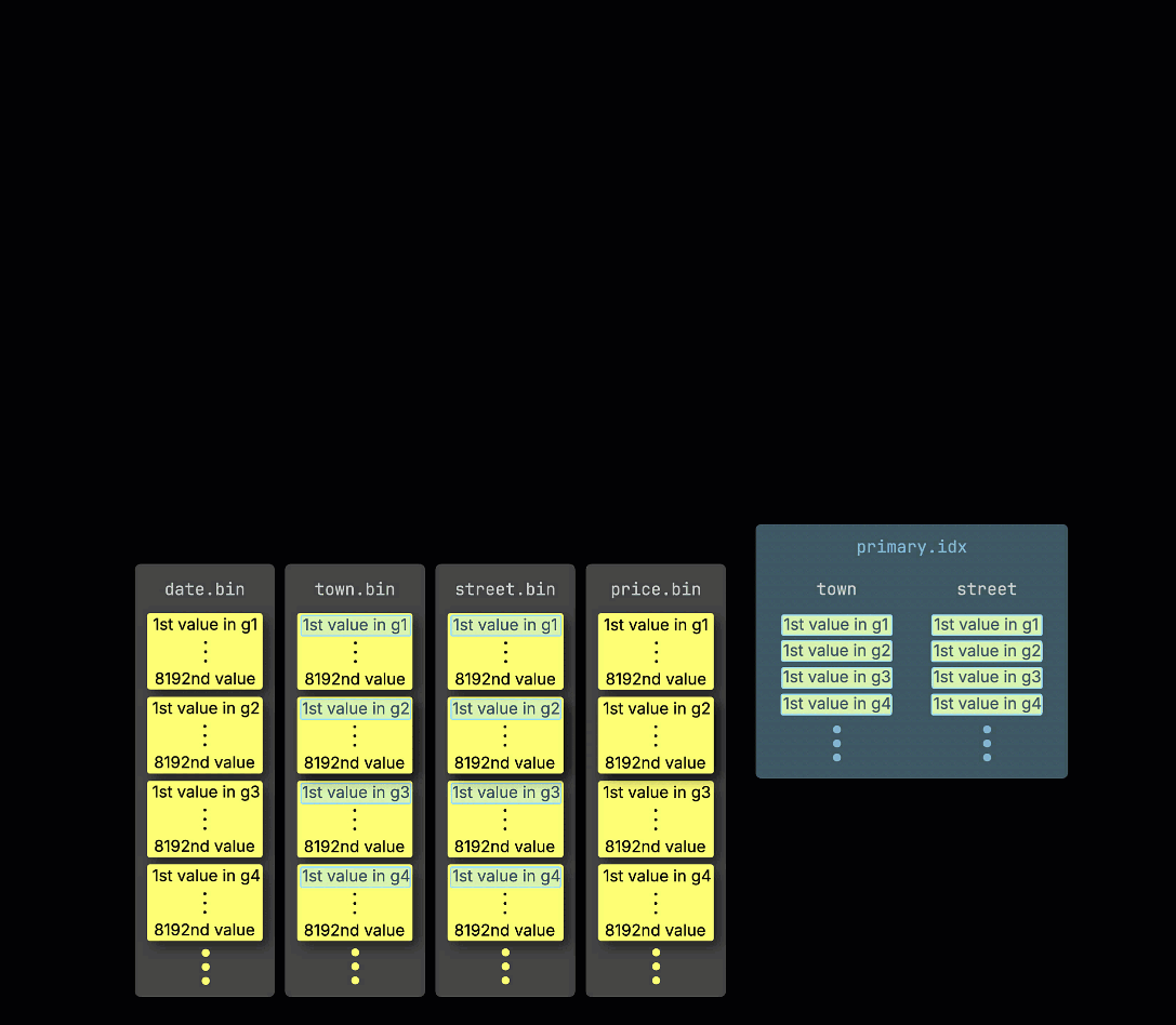 Как напоминание: в нашей ① примерной таблице с первичным ключом (town, street) ② вставленные данные ③ сохраняются на диске, отсортированными по значениям столбцов первичного ключа и сжатыми, в отдельных файлах для каждого столбца: